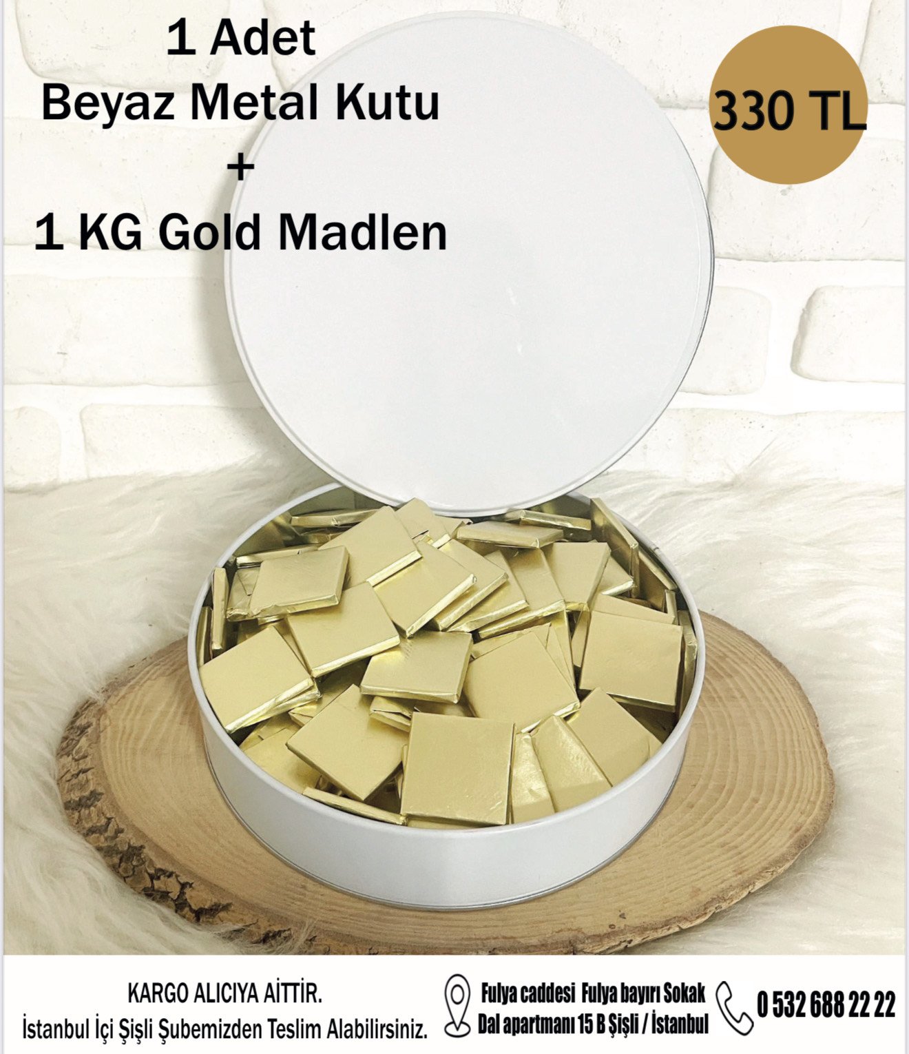 1 Adet Beyaz Metal Kutu + 1 KG Gold Madlen