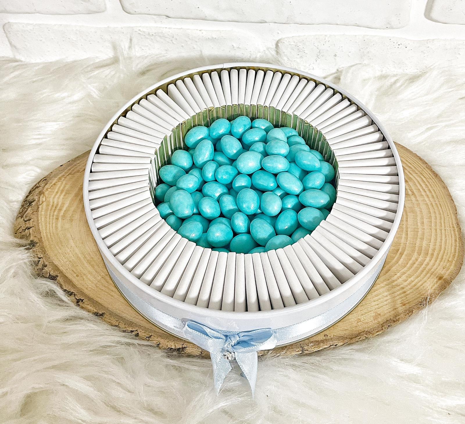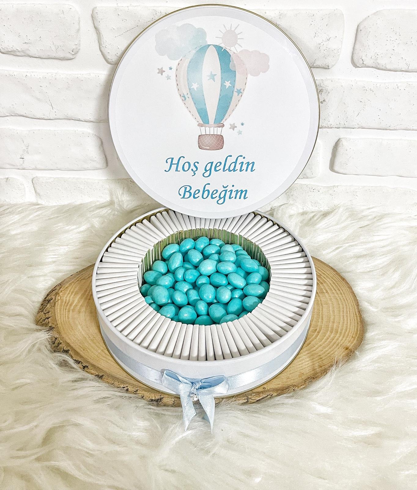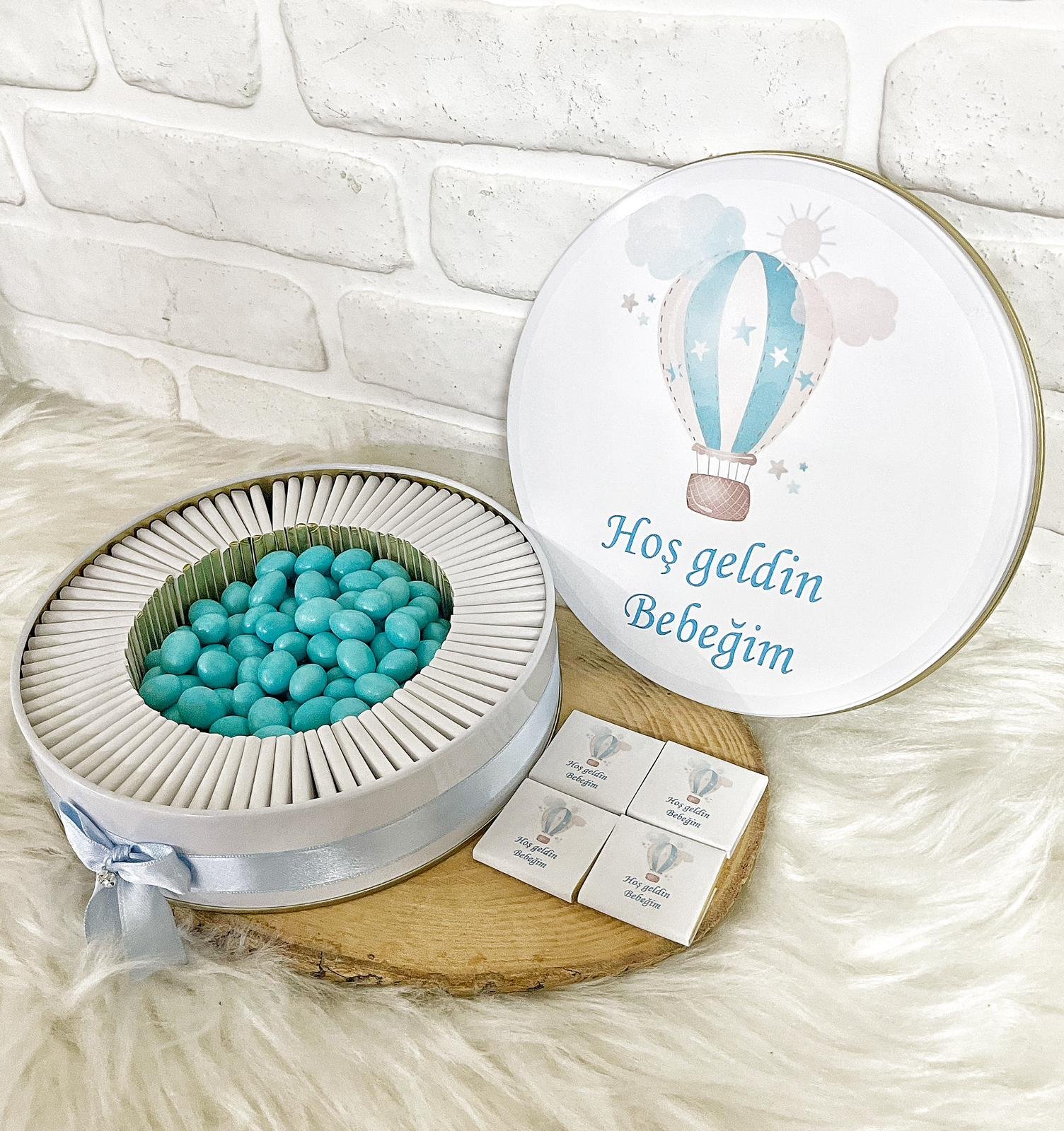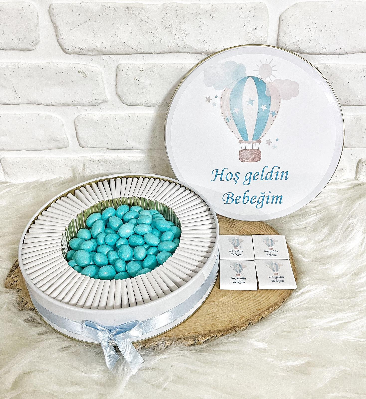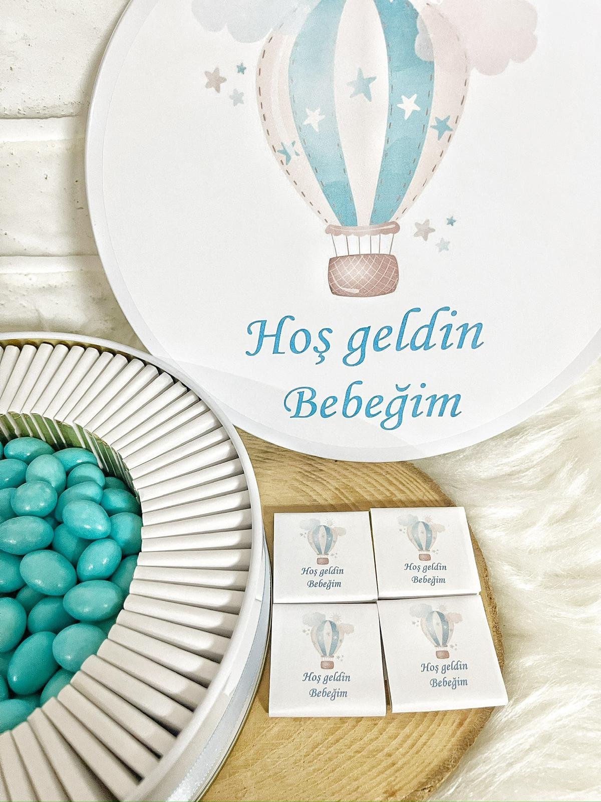 100 Adet+200 Gr Drajeli Hoşgeldin Bebeğim Erkek Bebek Mavi Uçan Balon Temalı Kutulu Hediyelik Madlen Çikolata