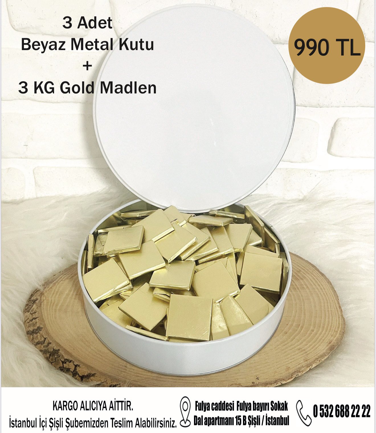 3 Adet Beyaz Metal Kutu + 3 KG Gold Madlen