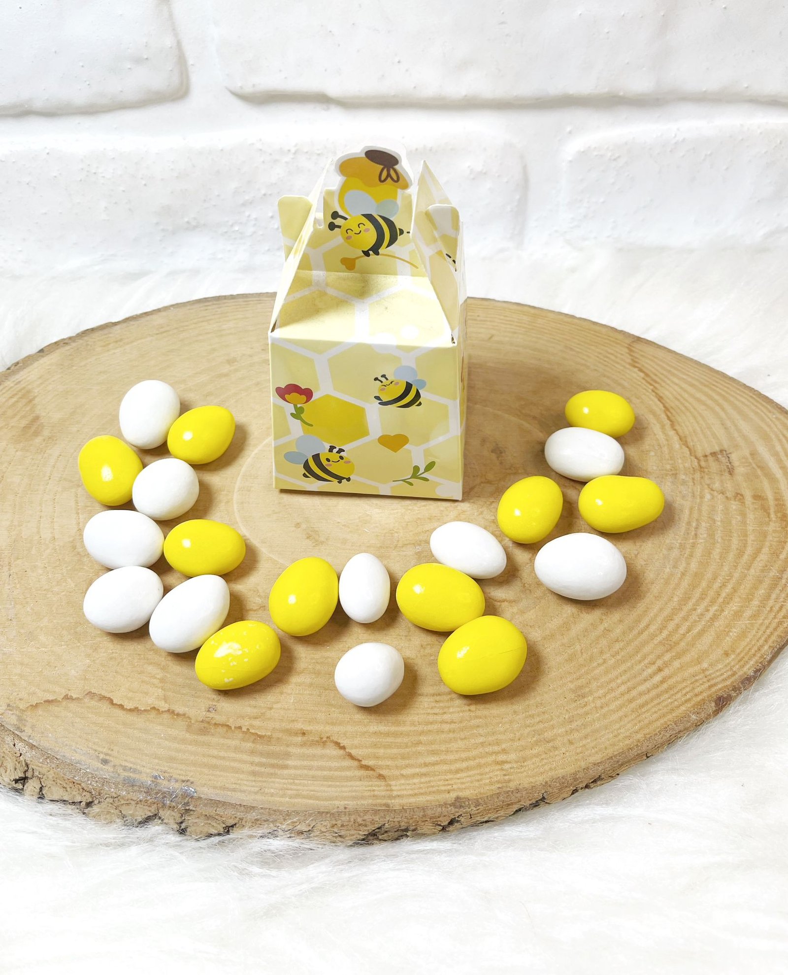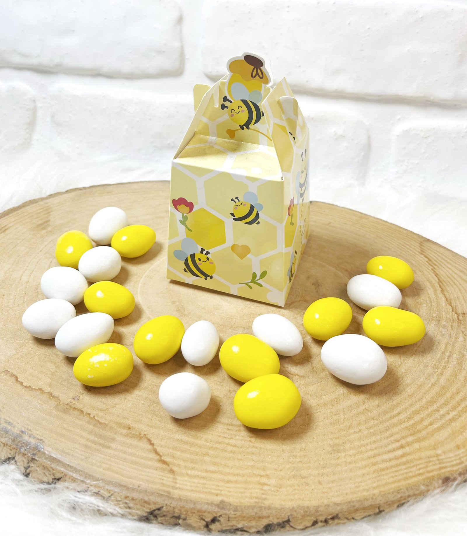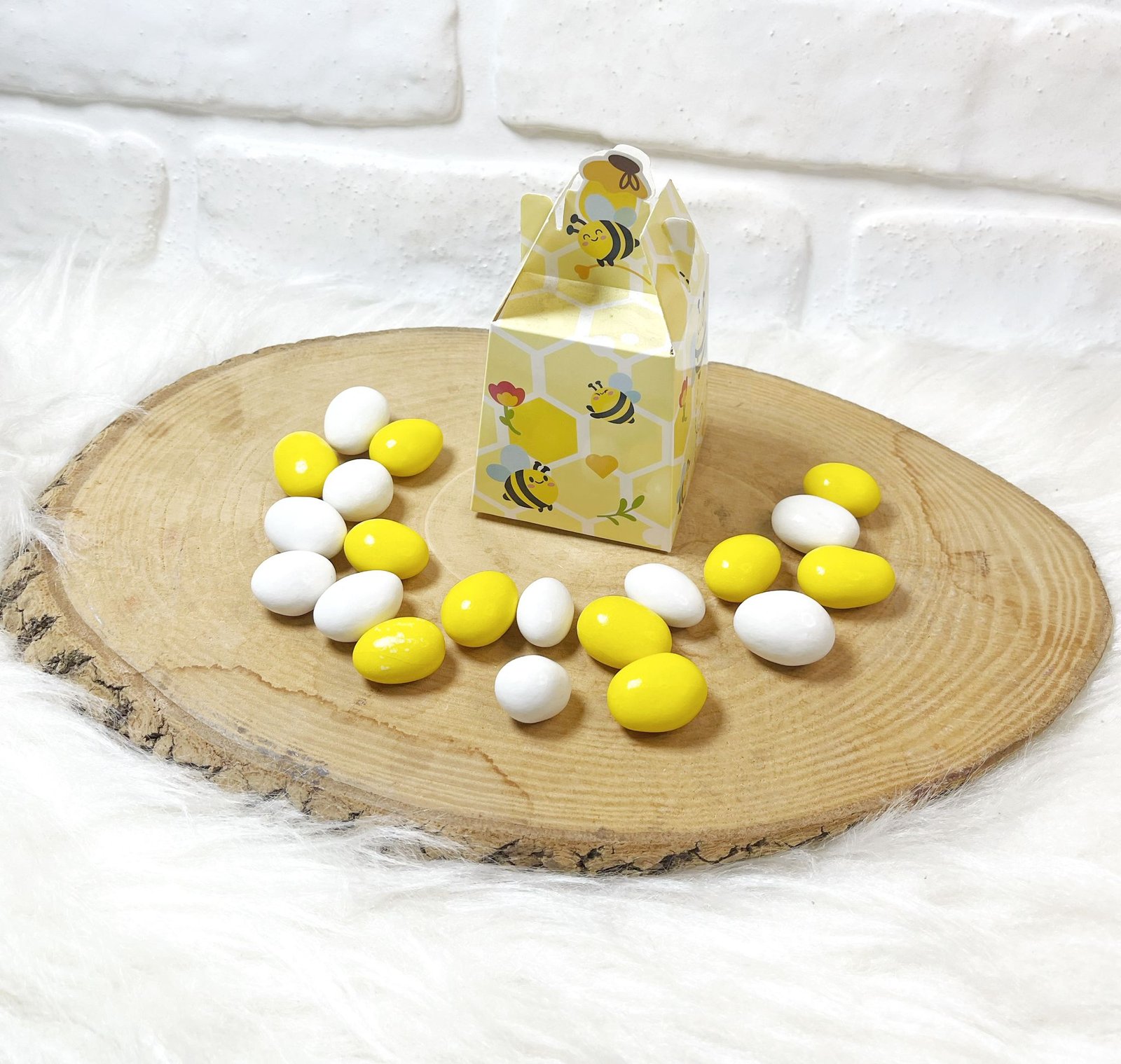 3 Boyutlu Özel Kutuda Arı Temalı Sarı-Beyaz Drajeli Doğum-Doğumgünü Hediyeliği