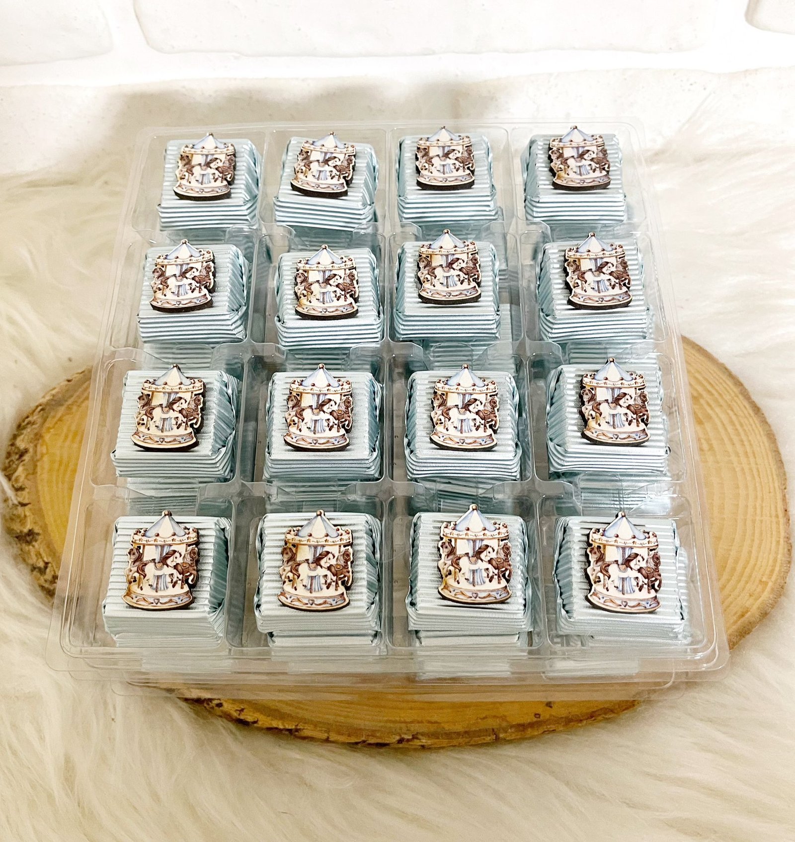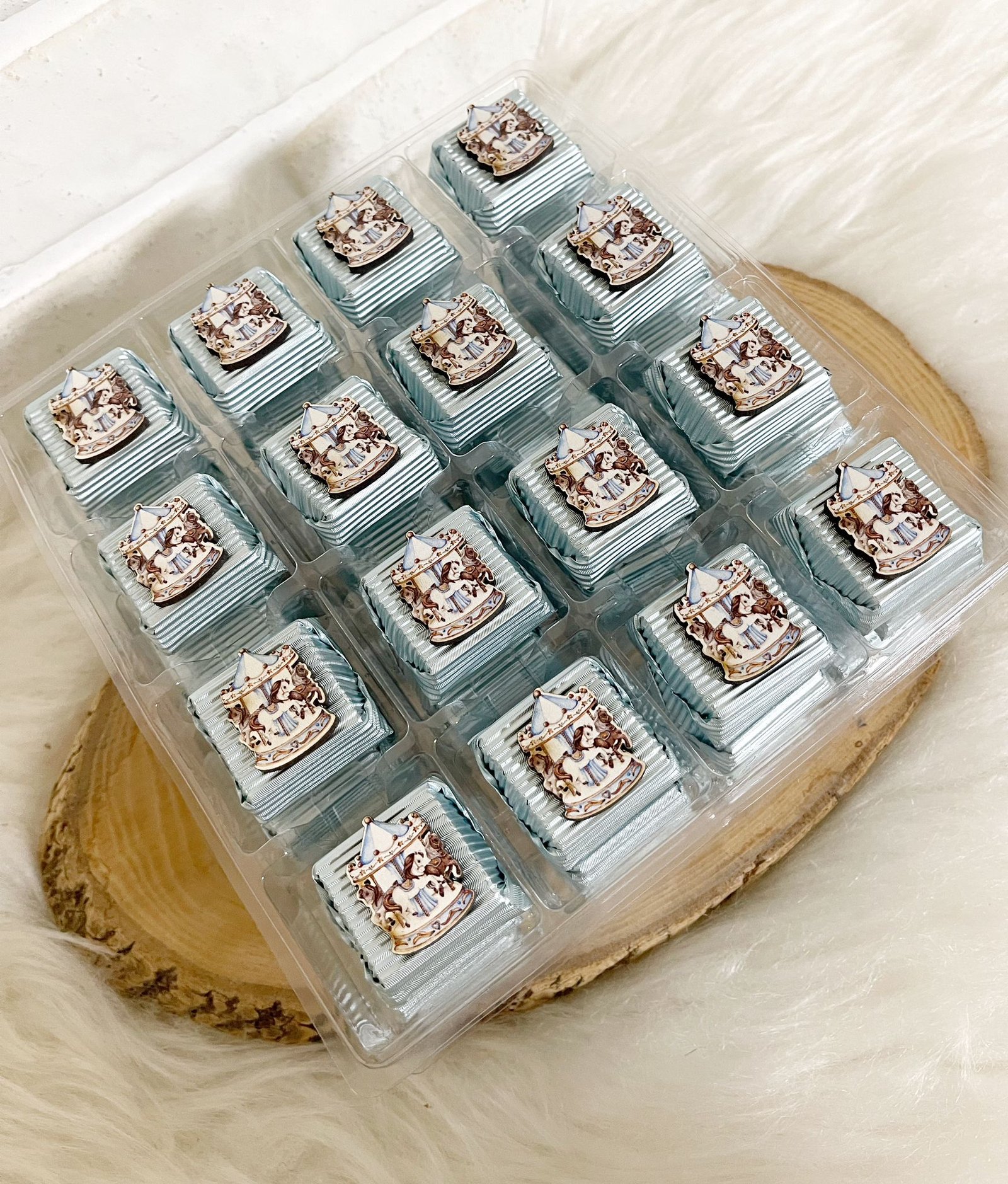 Atlıkarınca Figürlü Ahşap Dekorlu Erkek Bebek Mavi Oluklu Kalın Madlen Çikolata