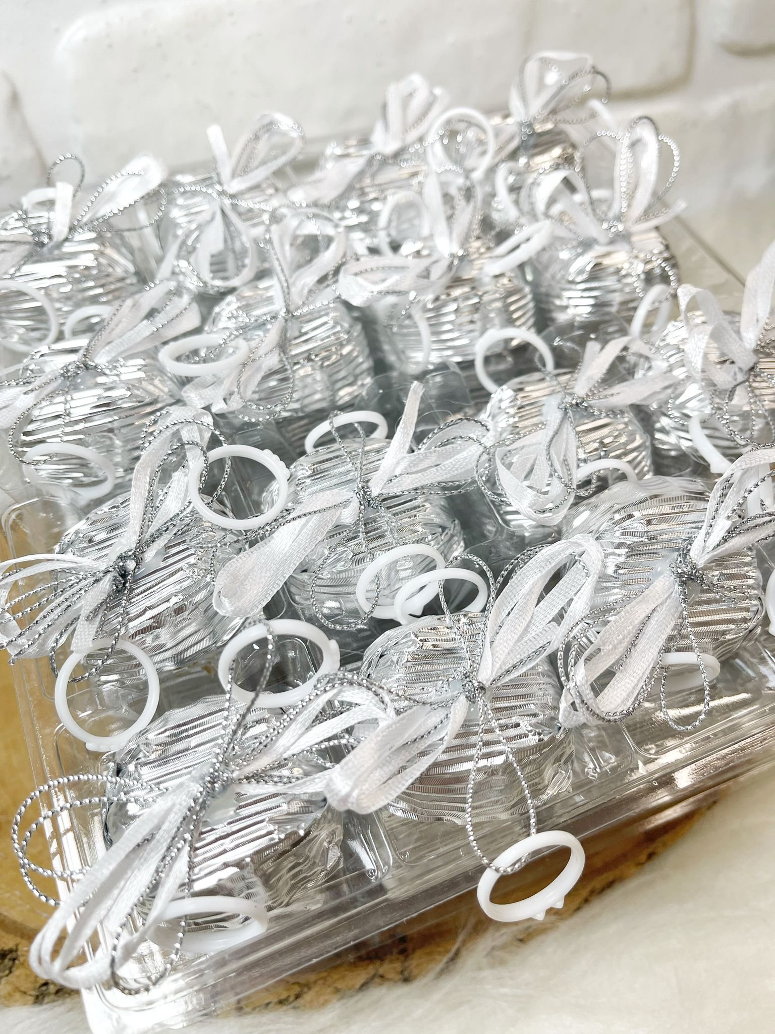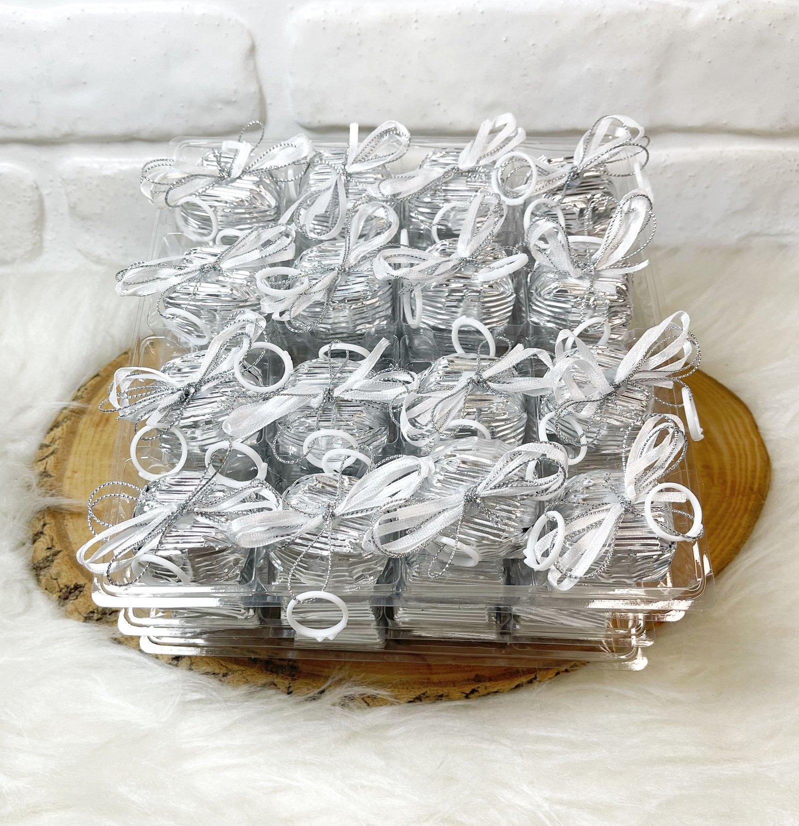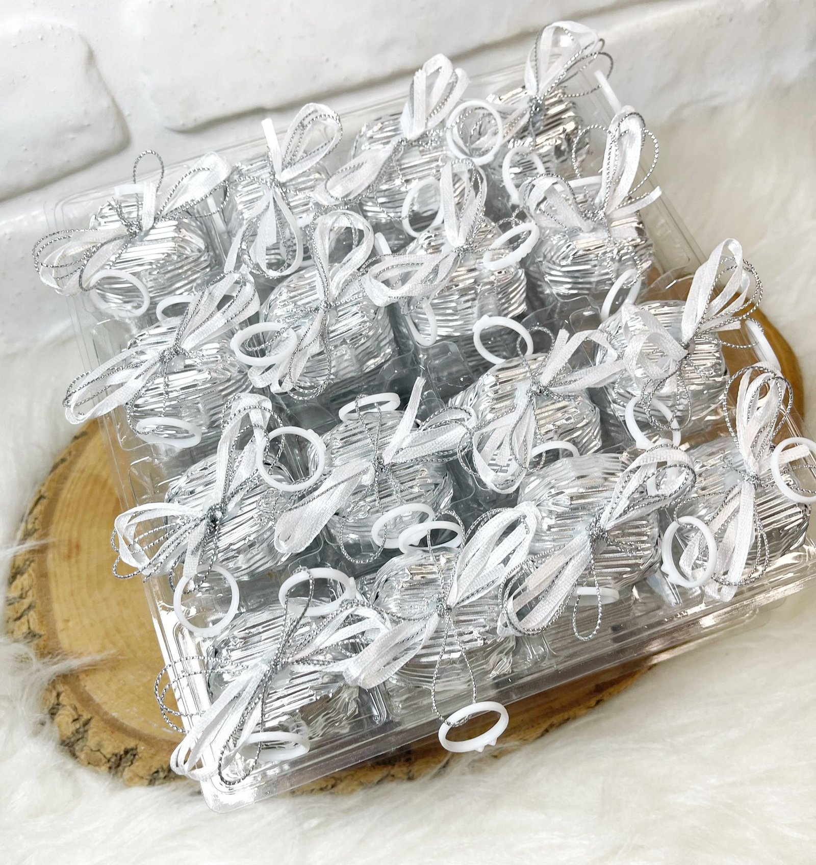 Beyaz Yüzük Dekorlu Kurdeleli Gümüş Papatya Oluklu Çikolata