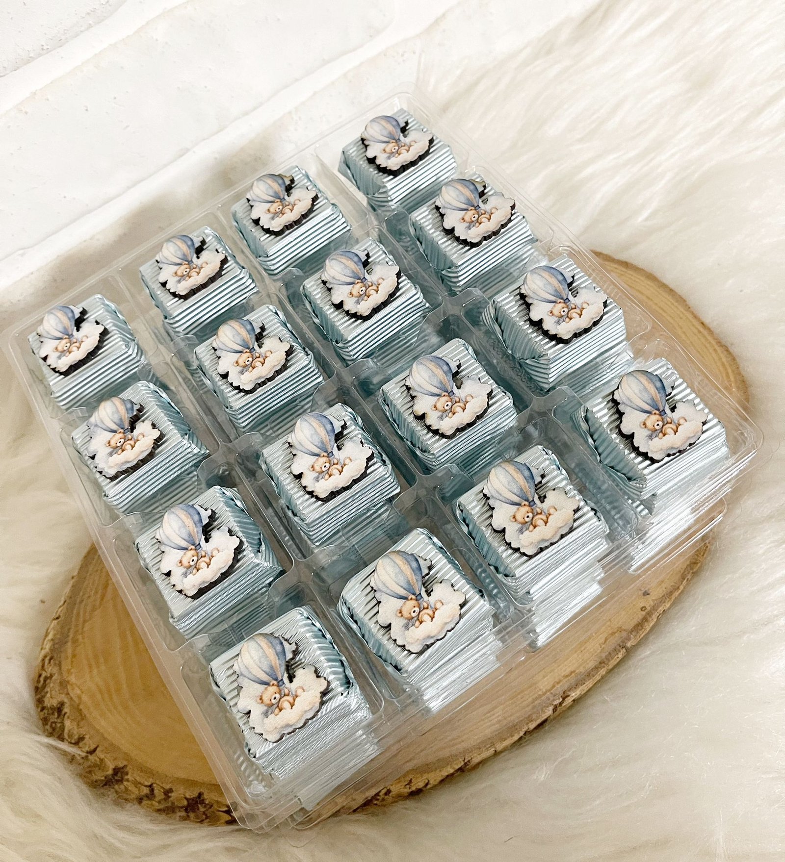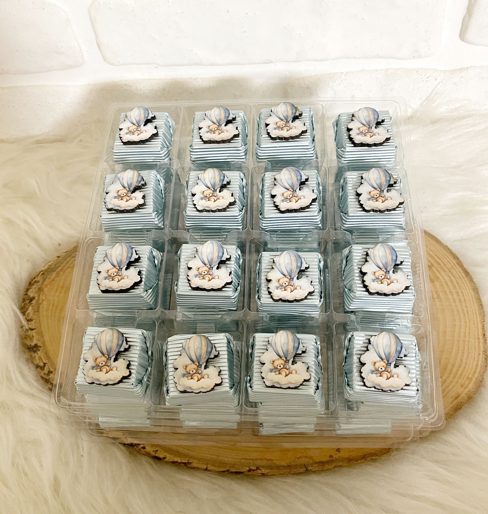 Bulutlu Uçan Balonlu Ayıcık Figürlü Ahşap Dekorlu Erkek Bebek Mavi Oluklu Kalın Madlen ÇikolataBulutlu Uçan Balonlu Ayıcık Figürlü Ahşap Dekorlu Erkek Bebek Mavi Oluklu Kalın Madlen Çikolata