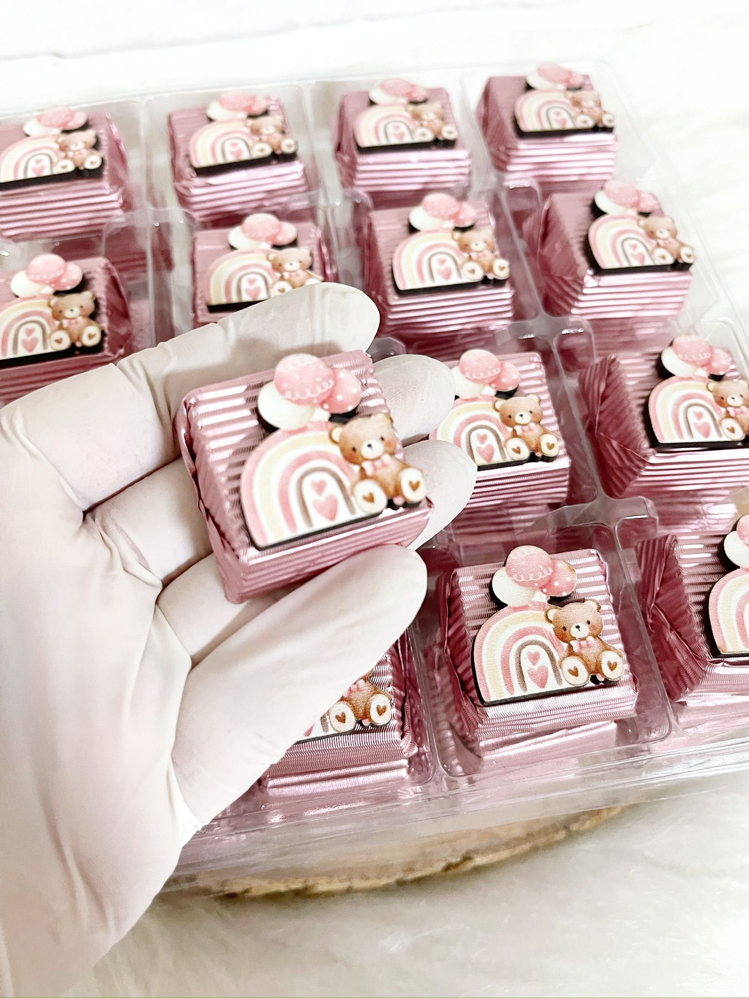 Gökkuşağında Balonlu Ayıcık Figürlü Ahşap Dekorlu Kız Bebek Pembe Oluklu Kalın Madlen Çikolata