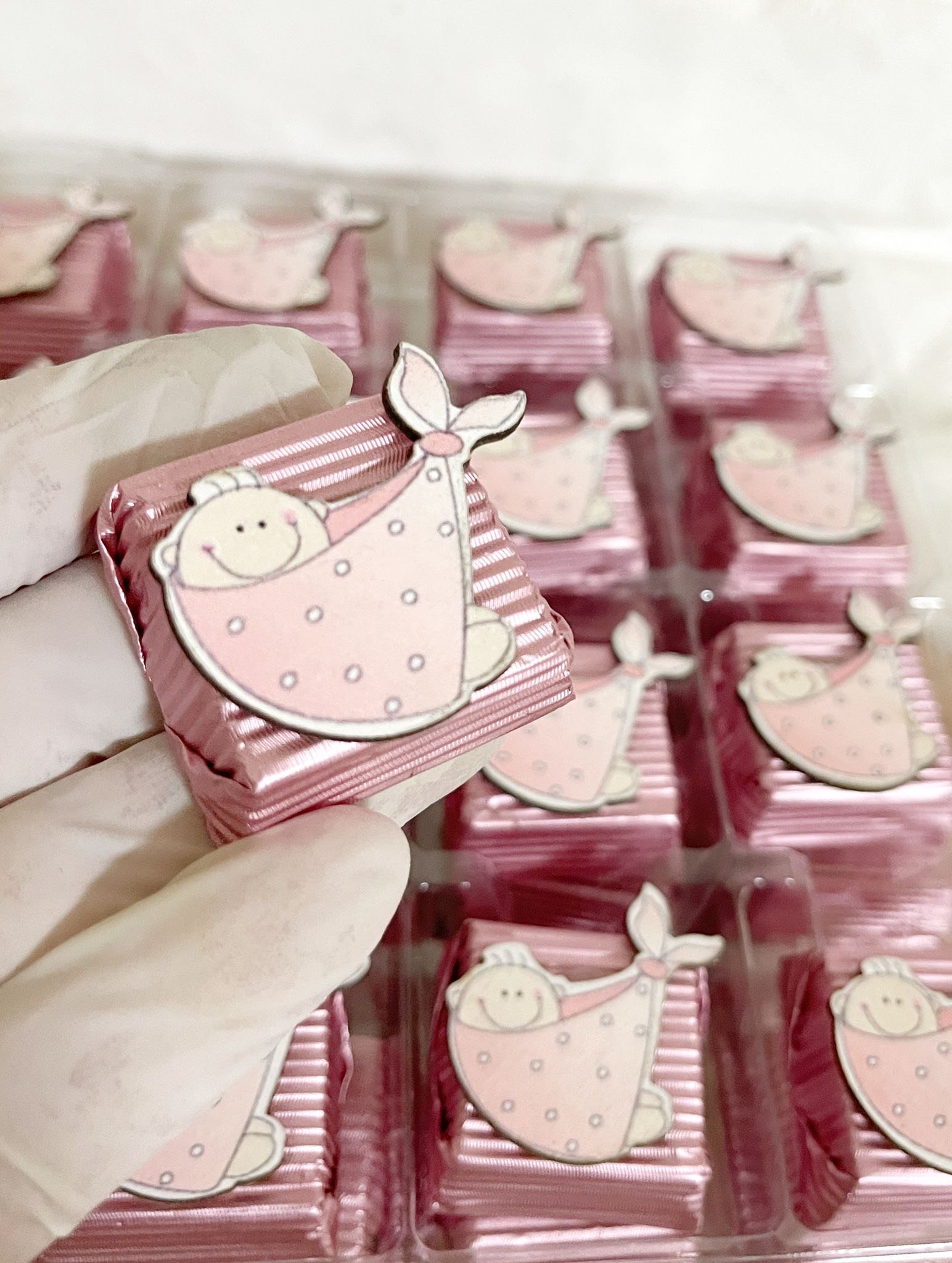 Zarif Sunumların Vazgeçilmezi: Pembe Sarılı Bebek Dekorlu Çikolata