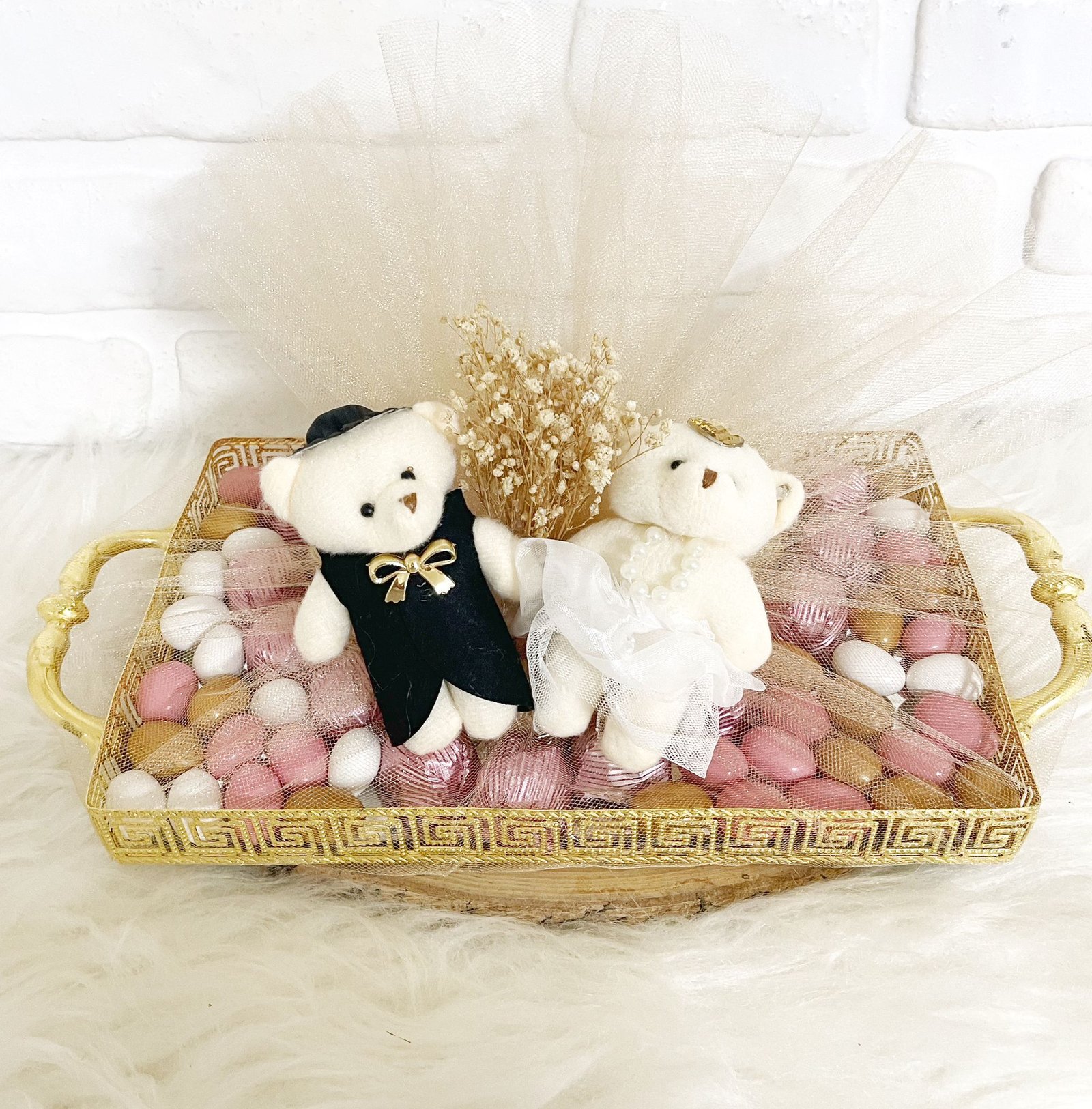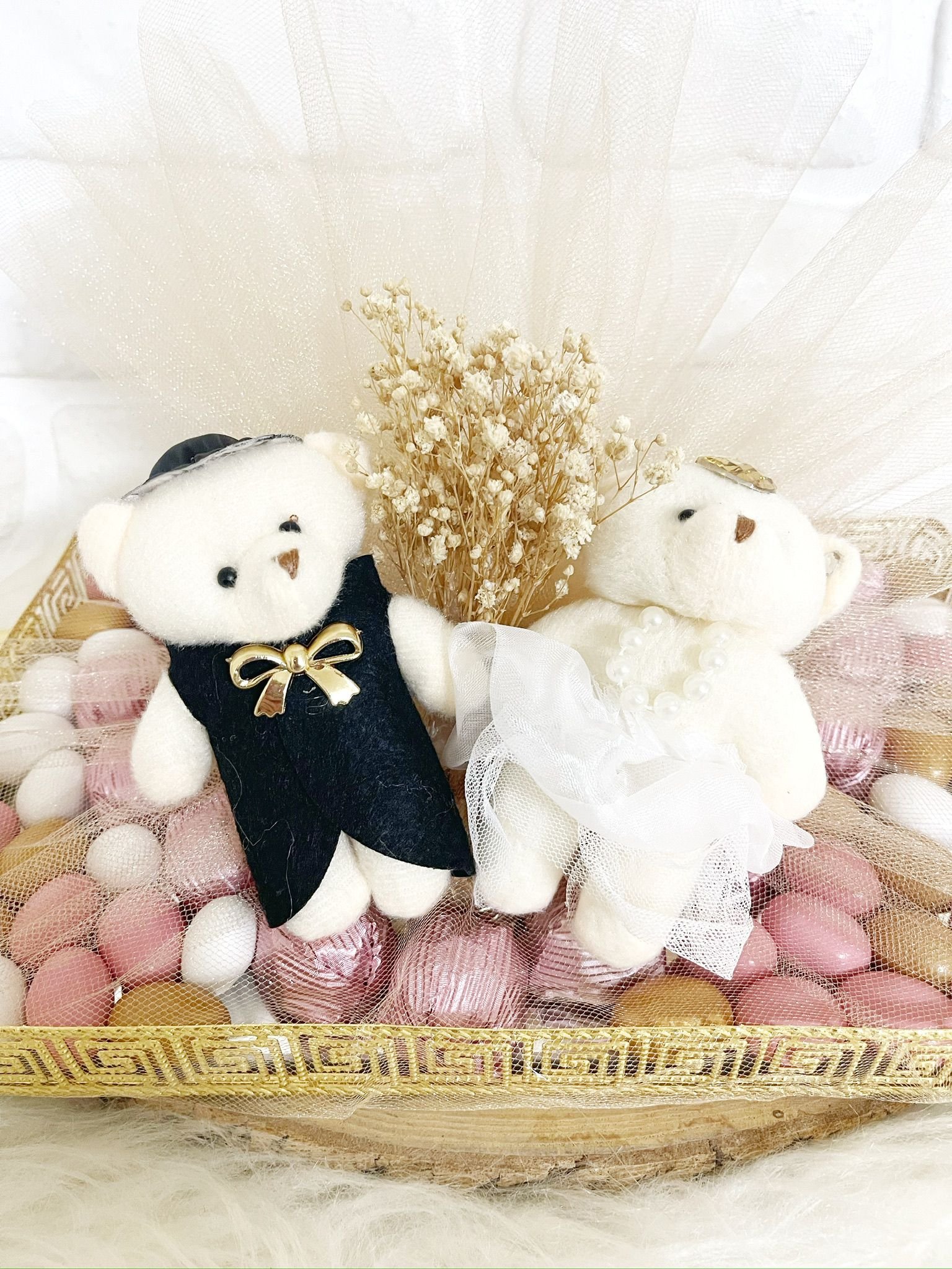 Tüllü Süslenmiş Gelin-Damat Ayıcıklı Aynalı Tepside Nişan-Kız İsteme-Söz Çikolatası