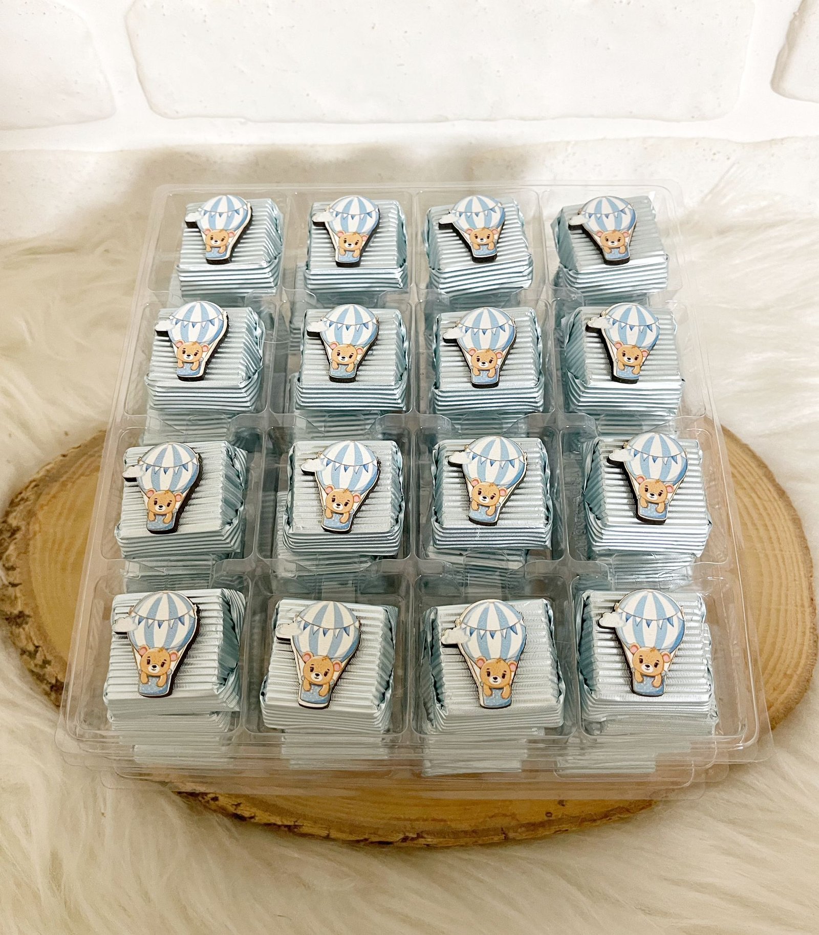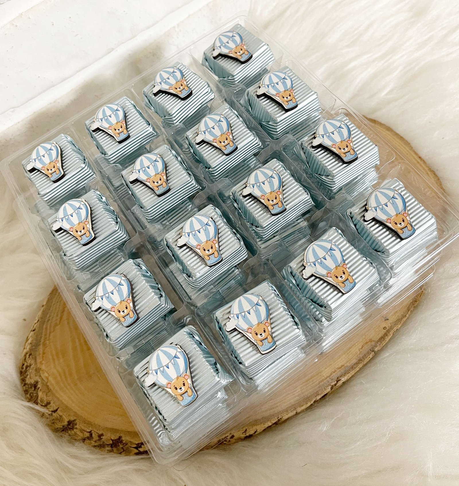 Uçan Balonlu Ayıcık Figürlü Ahşap Dekorlu Erkek Bebek Mavi Oluklu Kalın Madlen Çikolata